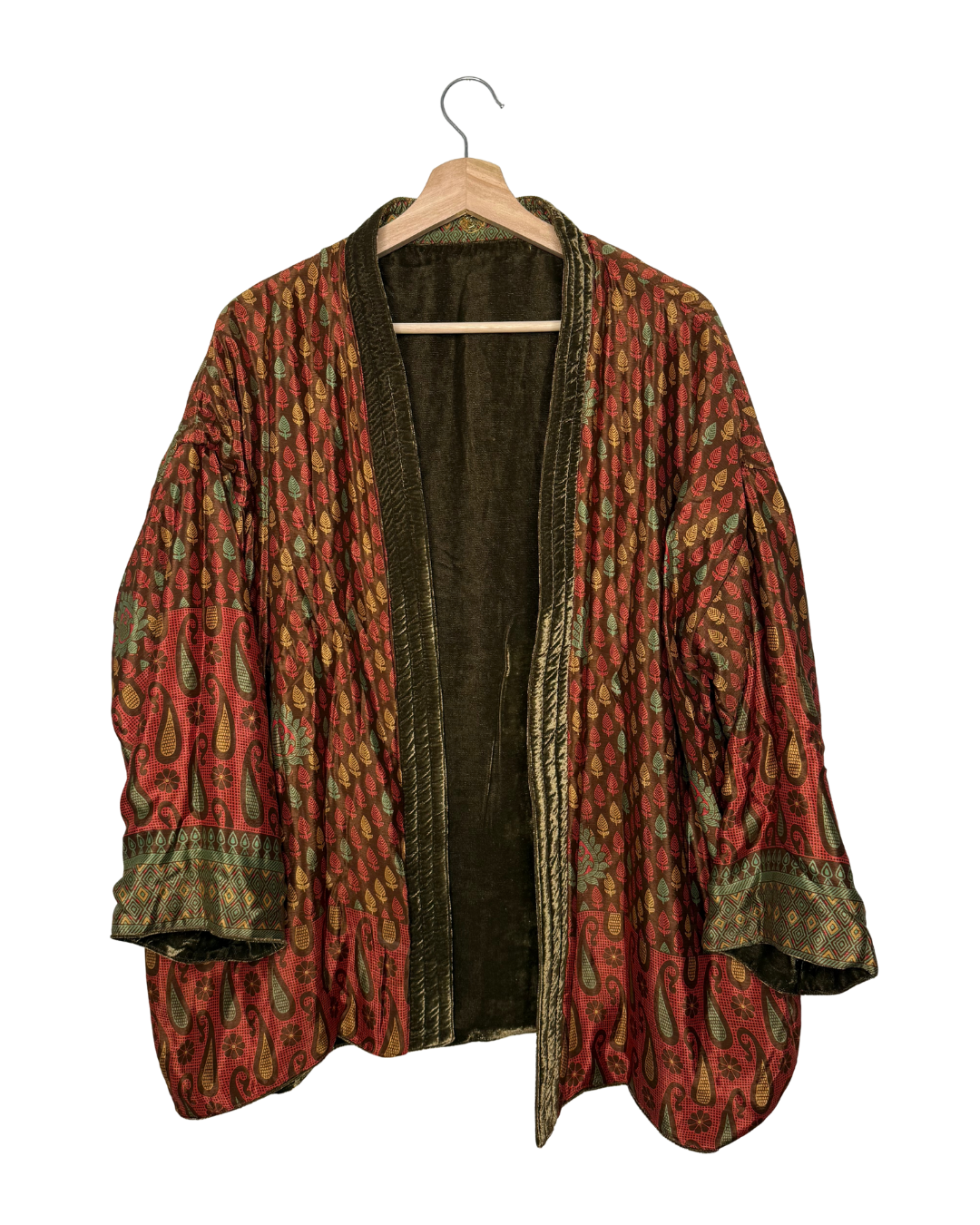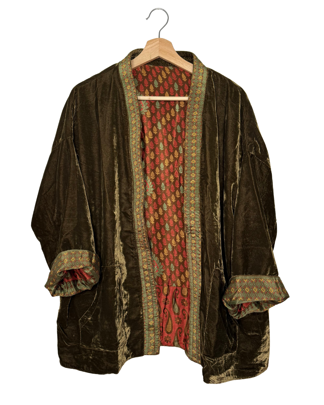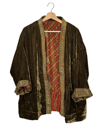 Veste kimono réversible avec poche en velours et sari vintage.