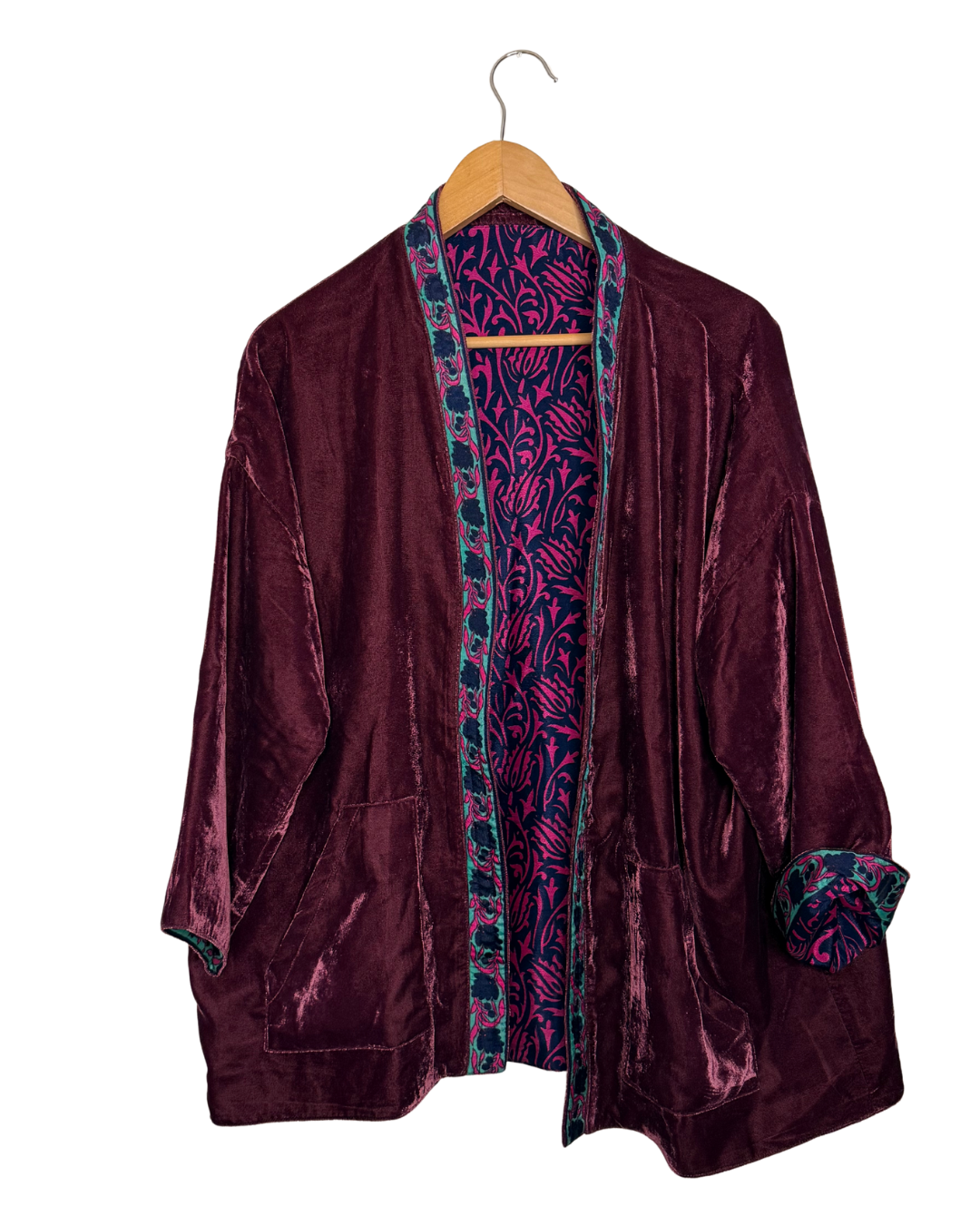 Veste kimono réversible avec poche en velours et sari vintage.