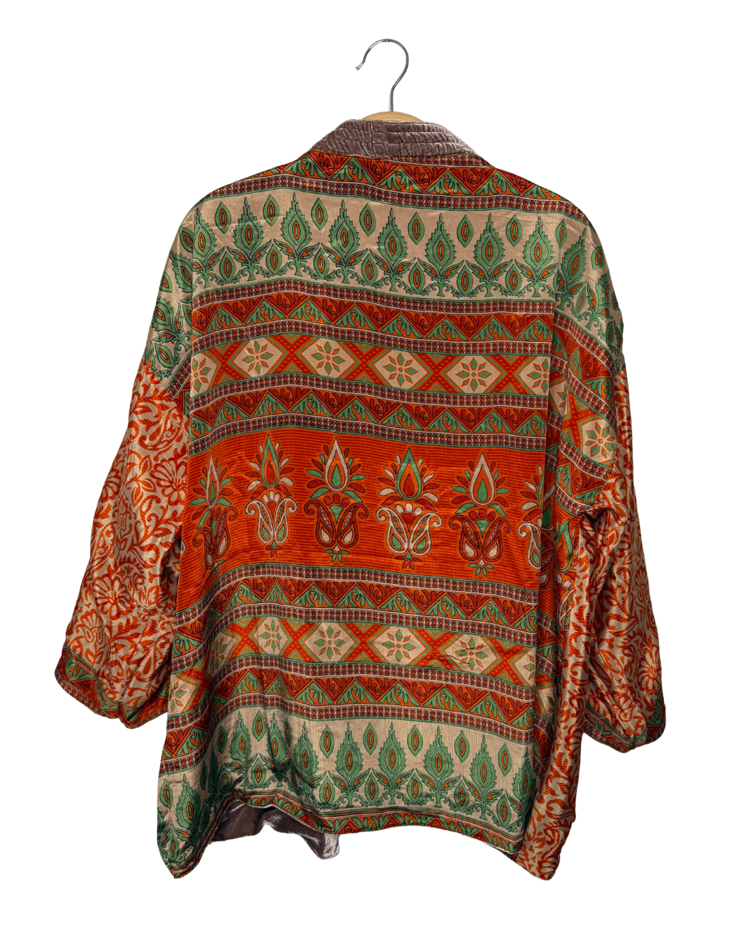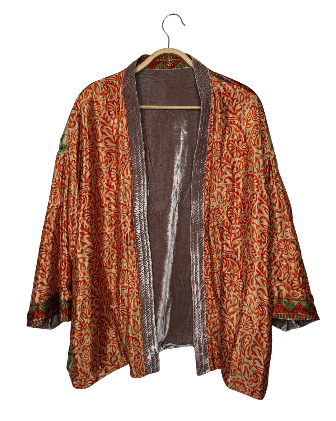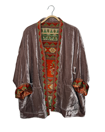 Veste kimono réversible avec poche en velours et sari vintage.