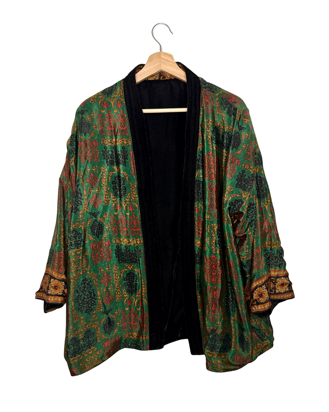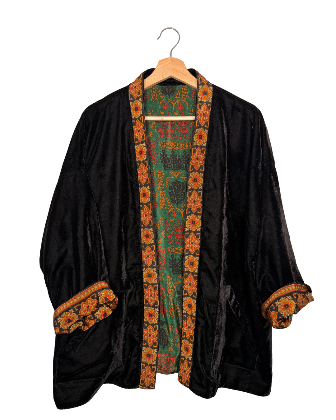 Veste kimono réversible avec poche en velours et sari vintage.