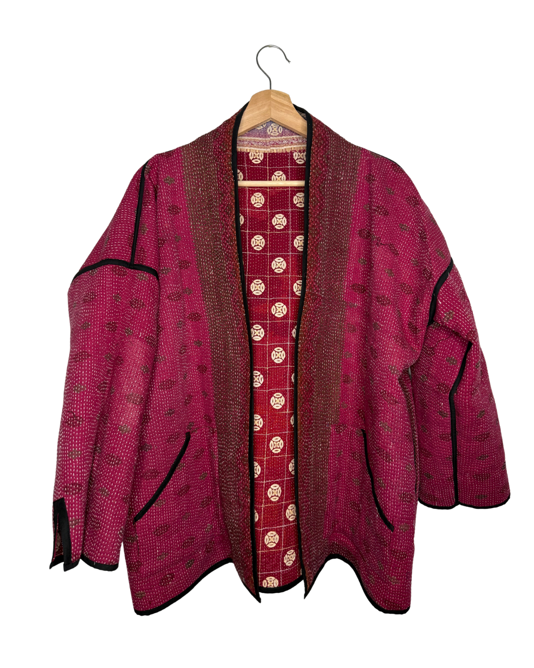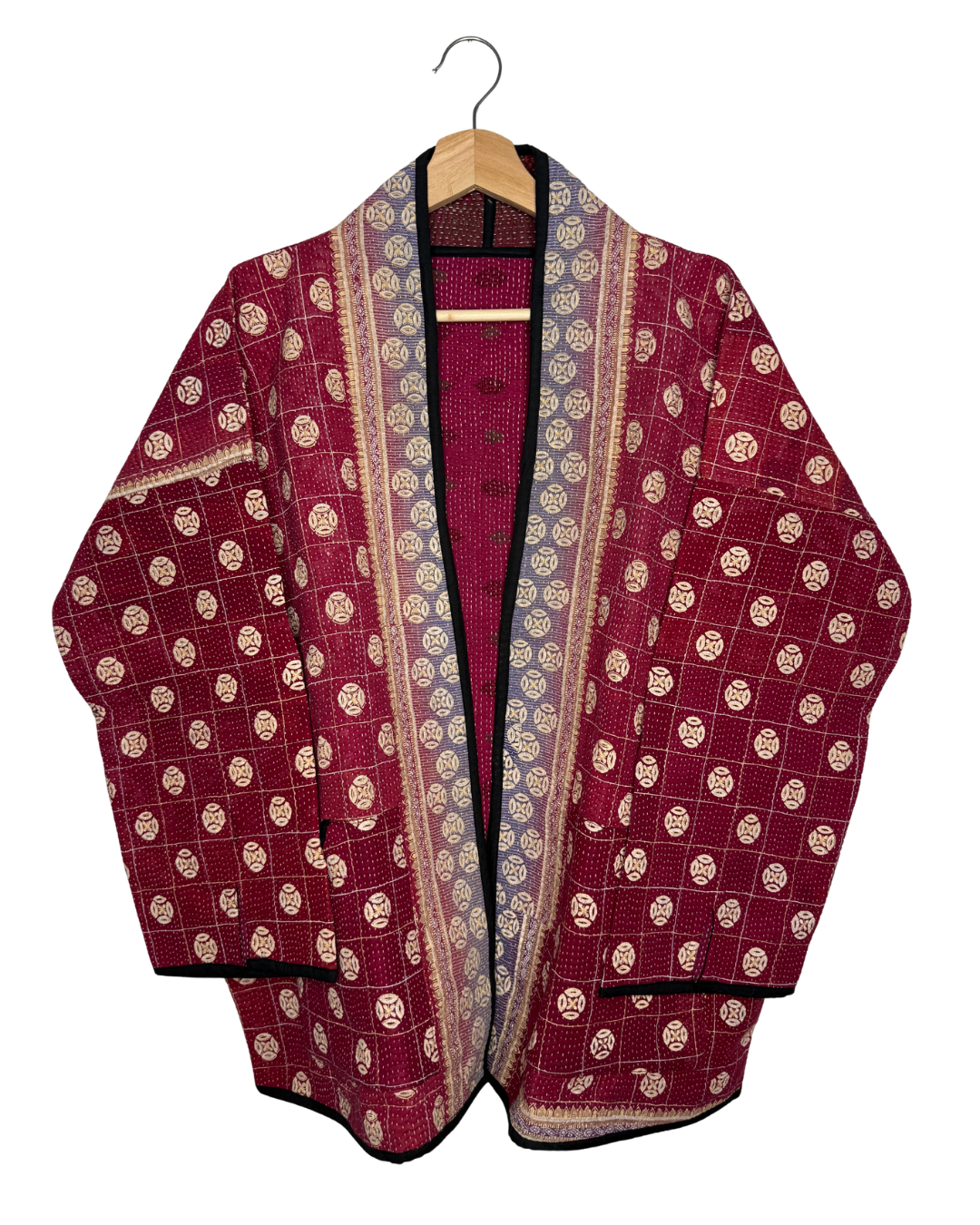 La veste Nana est confectionnée à partir de kantha ancien, un textile indien brodé à la main, pour offrir une pièce authentique, colorée et 100 % upcyclée.