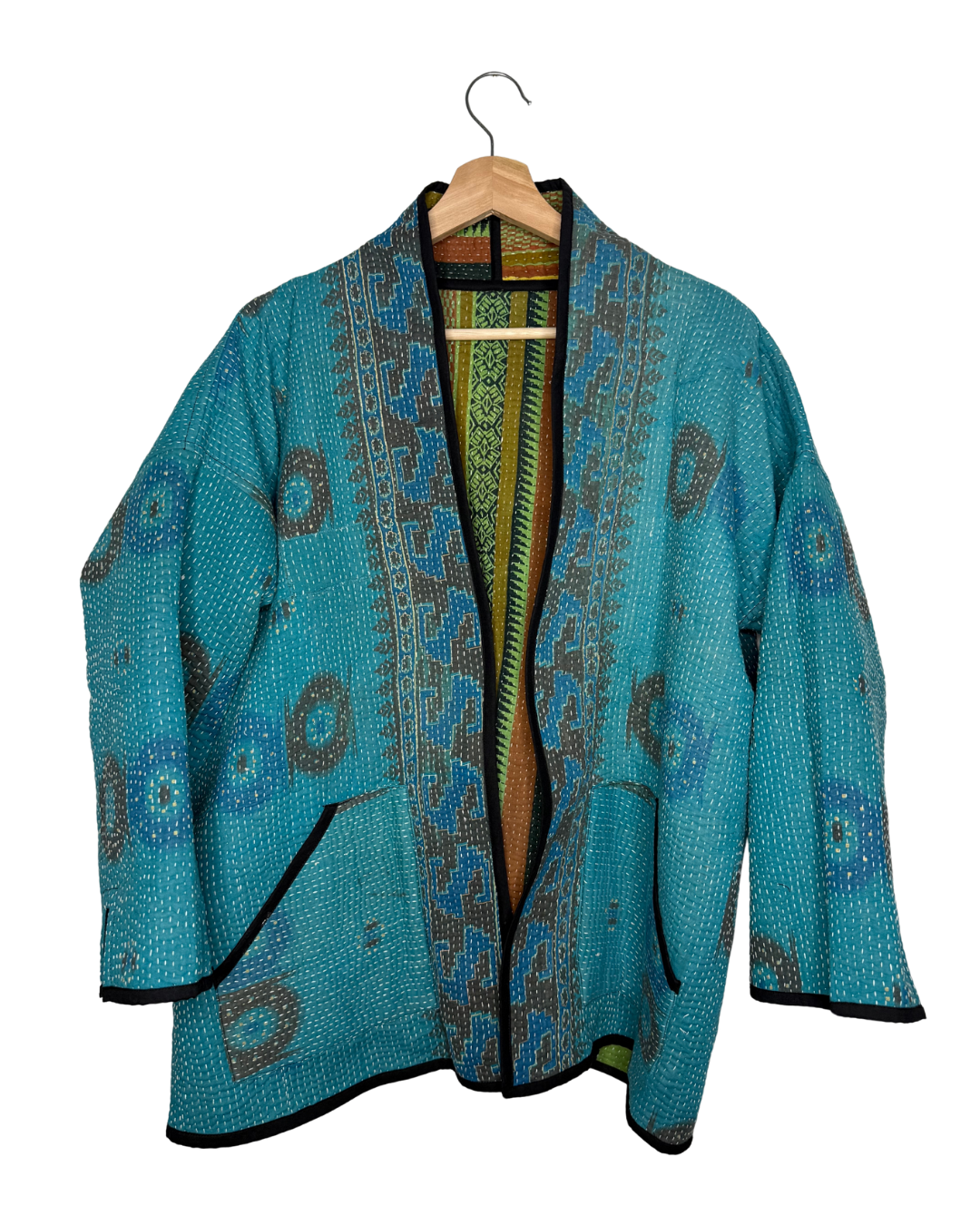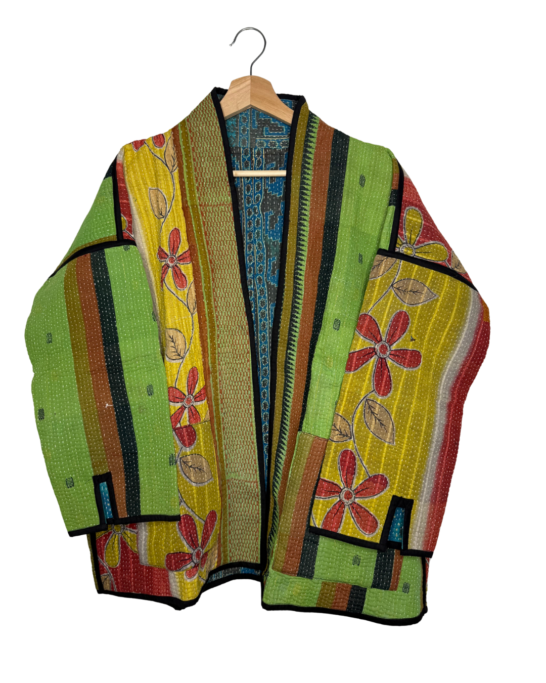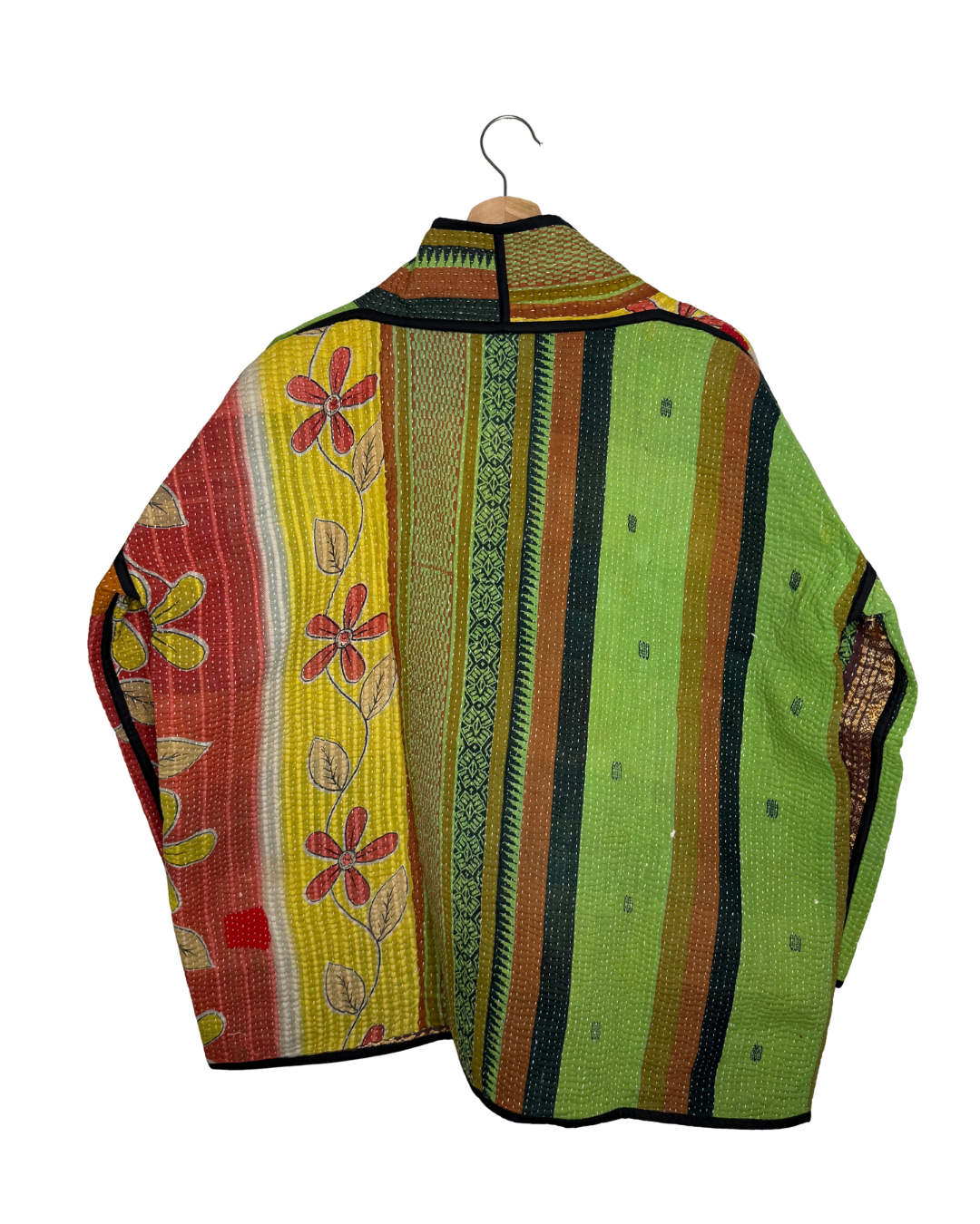 La veste Nana est confectionnée à partir de kantha ancien, un textile indien brodé à la main, pour offrir une pièce authentique, colorée et 100 % upcyclée.